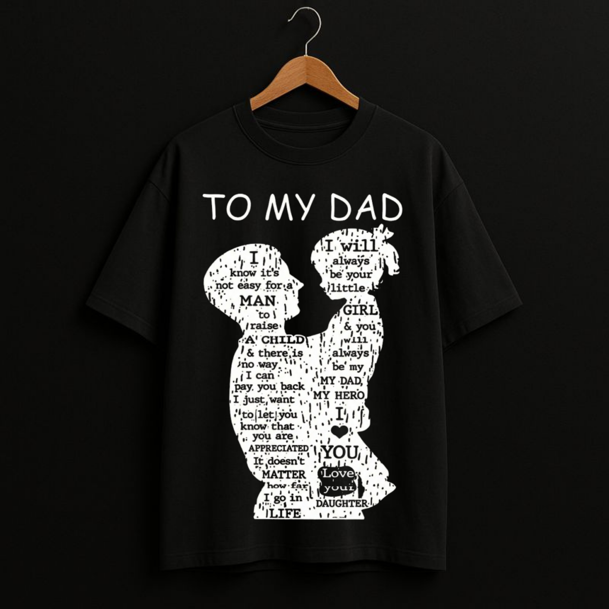 Celebrate the special bond between a father and daughter with our “To My Dad” T-Shirt. Featuring a beautiful artwork of a dad holding his daughter, filled with heartfelt words and appreciation, this design expresses love, gratitude, and the unbreakable connection shared between them.