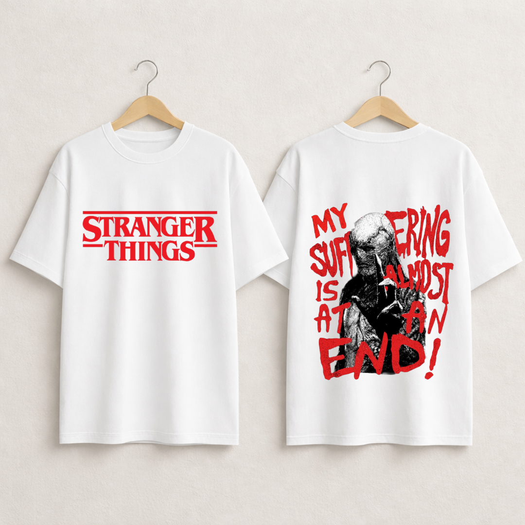 Inspired by the darker side of the Stranger Things universe, this oversized T-shirt delivers a powerful front-and-back statement design. With a bold red logo on the front and an intense graphic message on the back, this piece is made for fans who love mystery, horror, and unapologetic streetwear.