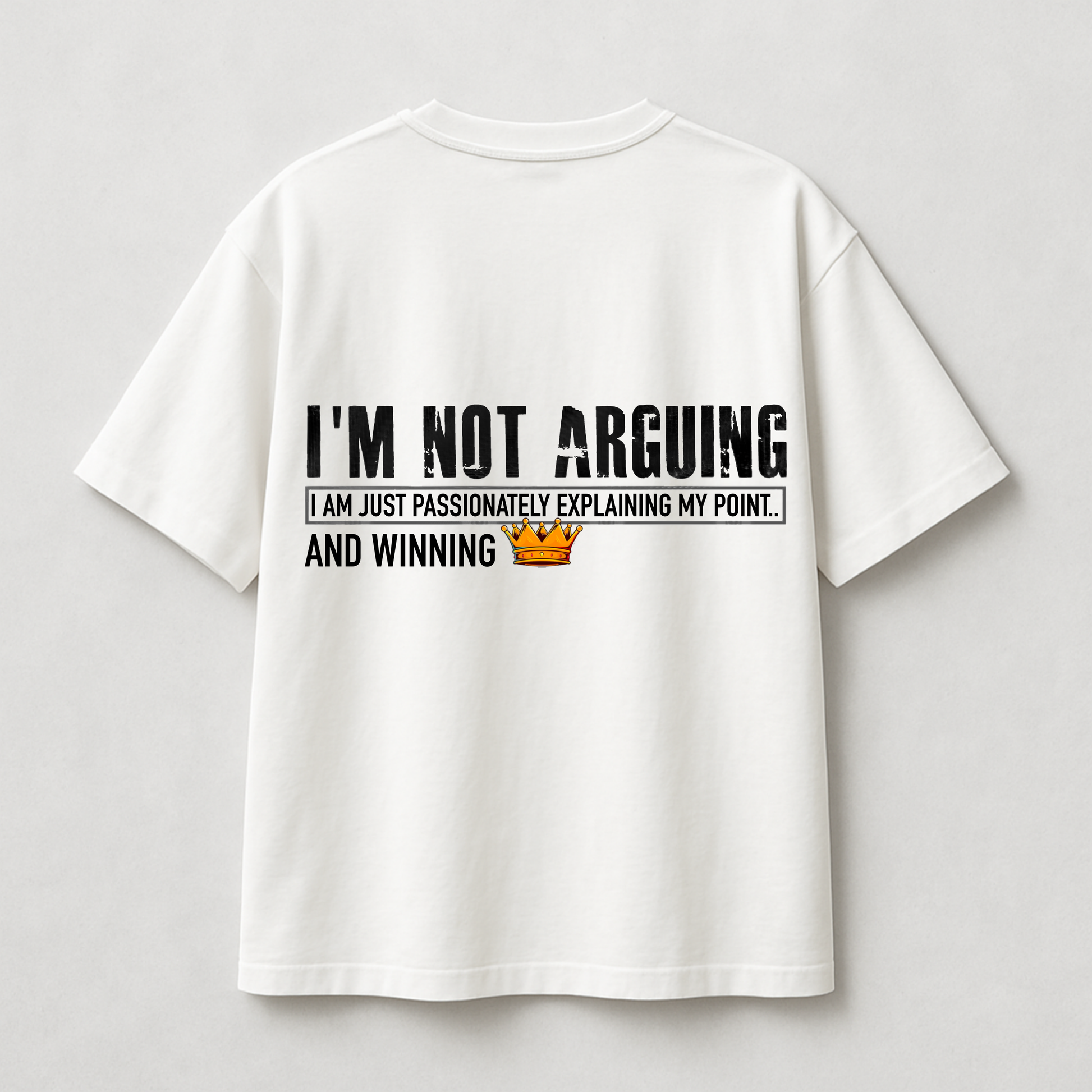 I'm Not Arguing... I'm Winning. This T-shirt is the perfect uniform for anyone who believes they're always right—or at least, has a very passionate way of explaining their point! Featuring the hilarious quote "I'M NOT ARGUING, I AM JUST PASSIONATELY EXPLAINING MY POINT... AND WINNING" topped with a crown, this tee is a playful, confident statement.